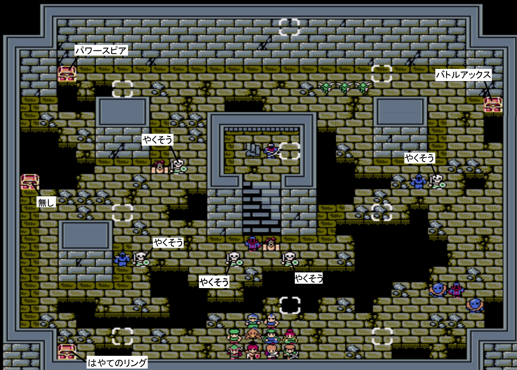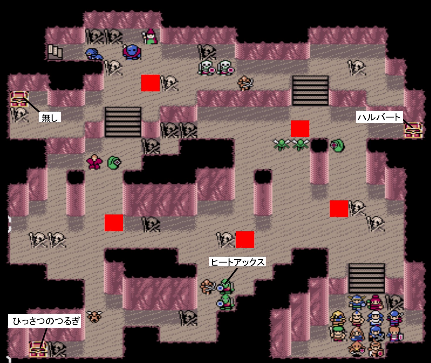 Battle.14![]() 【勝利条件:ミノタウロスを撃破】敵総数:17 ボウライダー(HP29/射程3)×2 ガーゴイル(HP29/飛行/ブレイズ2)×2 ウォーム(HP29/毒攻撃)×3 ビショップ(HP31/ヒール3)×2 イビルピクシー(HP35/飛行/睡眠攻撃)×2 デッドリーボーン(HP37)×2 グール(HP28)×3 ミノタウロス(HP30)×1 攻撃魔法持ちがいない為、難易度は低い。ココの「バスターショット、恵みの雨」は何度でも入手可能。前者は最強の弓で弓手用に2つ入手したい。 ステージクリア後、ウォリアーのゲイツが加入。 |