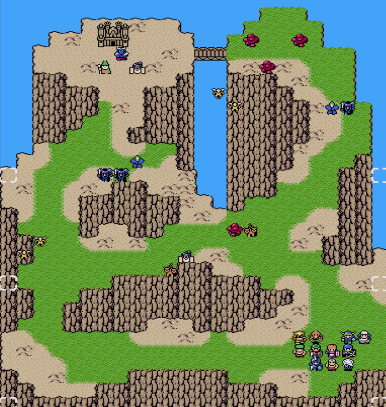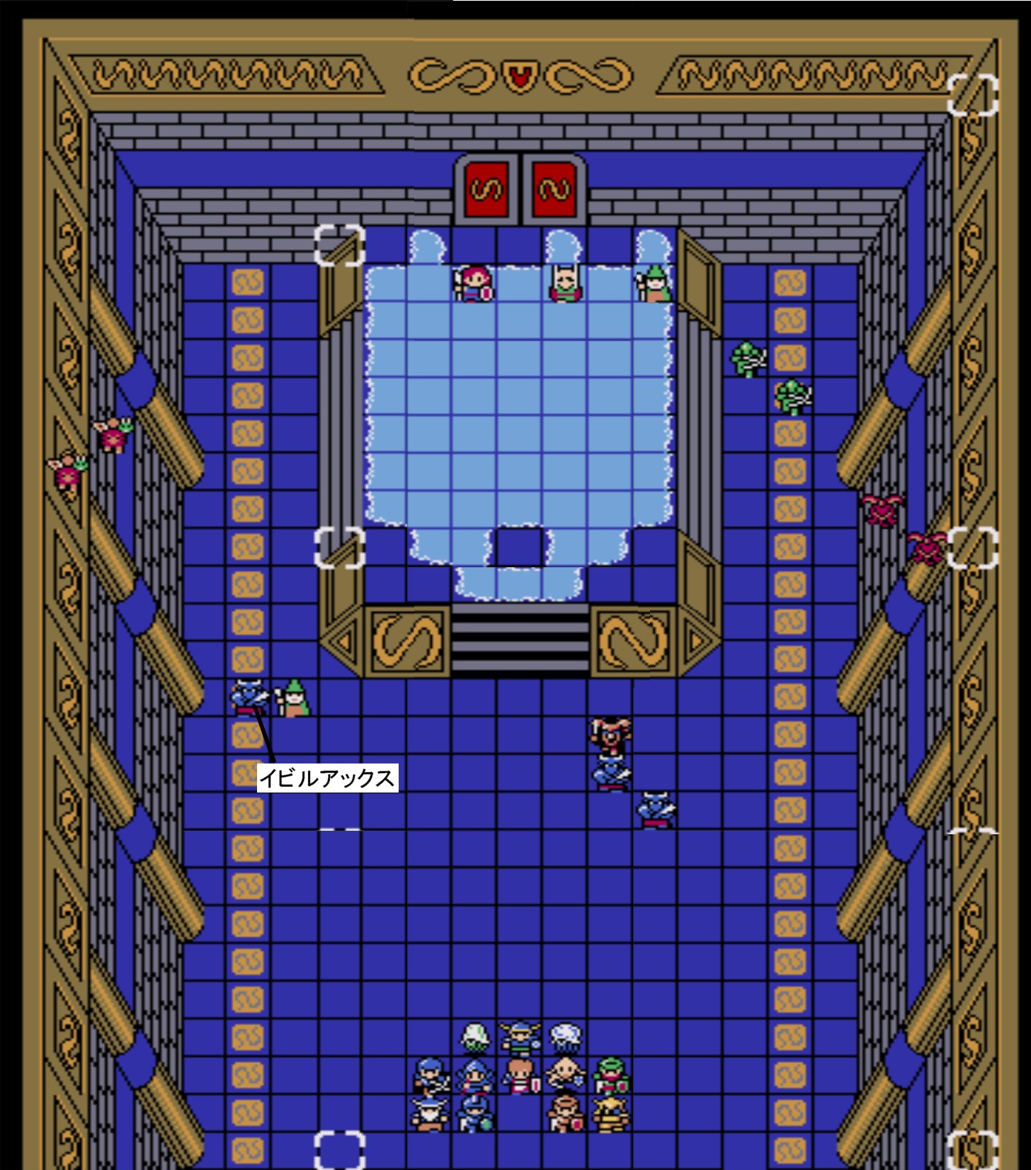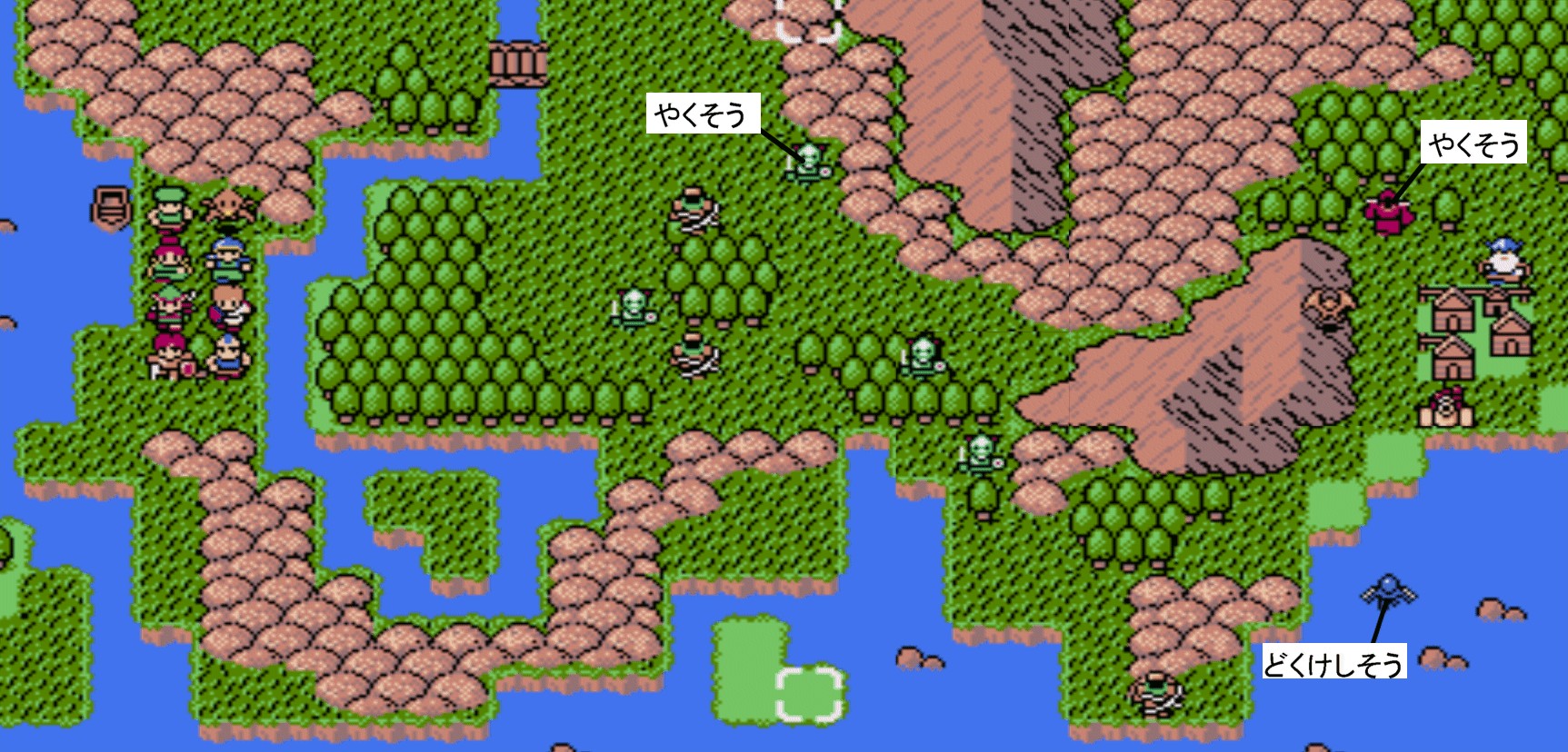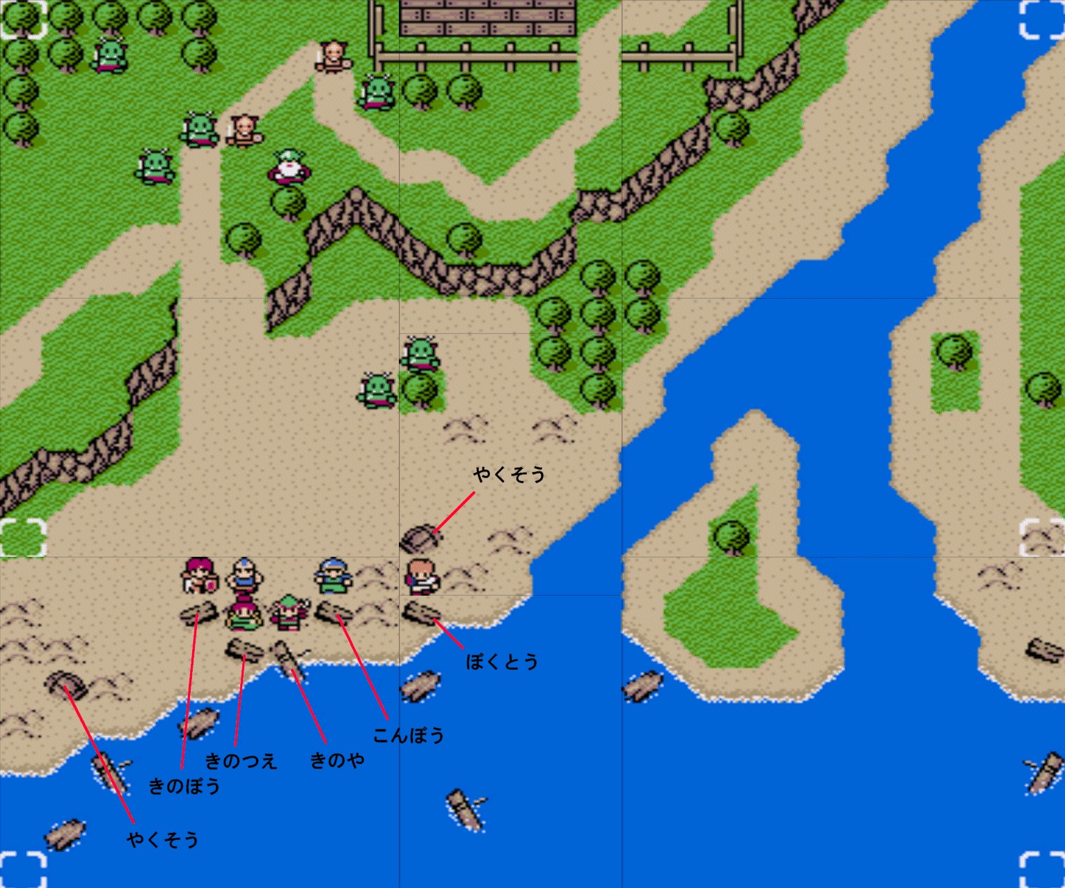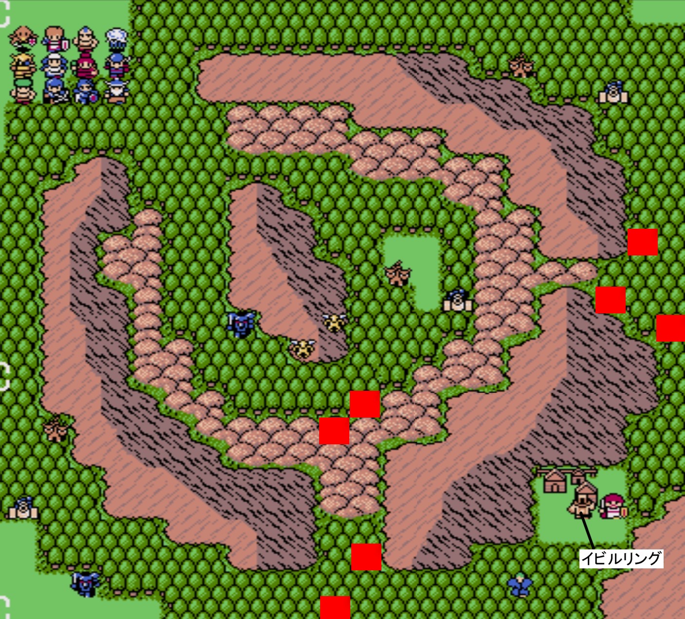 Battle.12![]() 【勝利条件:デッドリーボーンを撃破】敵総数:17 リザードマン(HP24)×3 アークナイト(HP29)×2 ソーサラー(HP29/フリーズ2)×2 ボウライダー(HP29/射程3)×2 ガーゴイル(HP29/ブレイズ2)×2 ウォーム(HP29/毒攻撃)×3 ビショップ(HP31/ヒール3)×2 デッドリーボーン(HP37)×1 障害物が一切無いMAP。敵が多く密集しやすい為、範囲魔法を活かし易い。その為、リターン周回修行所としては向いている。 尚、東側の池付近を調べると隠しユニット「魔法生物 ドミンゴ」が加入する。 |