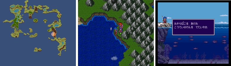 | 48 | 共同体南東の釣りポイントから「皇帝の剣」、ゲイト村北西の釣りポイントから「命の鎧」入手(任意)。 主人公の最強武器。特に剣は終盤に入ると入手不可になるので注意。 |