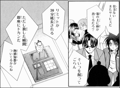 謎解き爆弾の熱感知器を自ら握って30分延長させ、歩に謎解きの時間を与える。