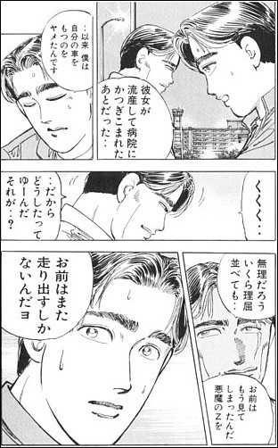 かつて車にのめり込み、その結果妻を流産させてしまった過去を持つ男 平本。その後は走り屋としての活動は辞め、妻を労わりながら仕事をしていたが、悪魔のZに出会い、走り屋としての自分が再燃する。しかしもうあの時の自分に戻るワケにはいかない。そう思っていた所に北見さんが走りの世界へと引きずり込む。まさに悪魔のささやき。一見他人事のように軽く言ってるように見えるけど、ここで自分に白黒付けておかないと、これからの人生は後悔に彩られるぞ。と言っているんでしょうね。