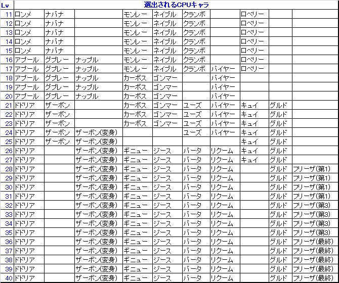 - Lvによって選出されるCPUキャラが異なる。詳細は下表を参照。(Z戦士とベジータは例外でいつでも選出される可能性がある)