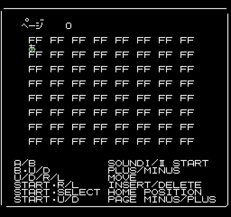 ページ0の一番左上の数値をB+上下ボタンで切り替え、スタート+セレクトで決定すると番号に対応した音が鳴る。00~7Fが効果音、80以降はBGM。