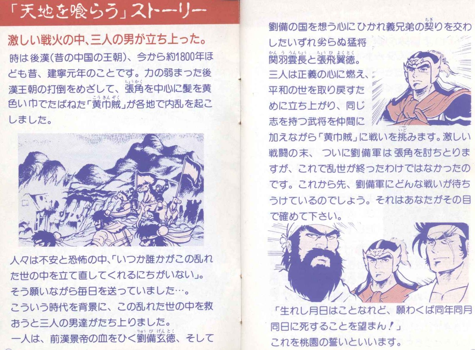 簡単に言って「政府が腐ってるから盗賊が暴れまわってるという最悪の状況を劉備・関羽・張飛の3人が変えてやろうぜ!」と立ち上がる話。