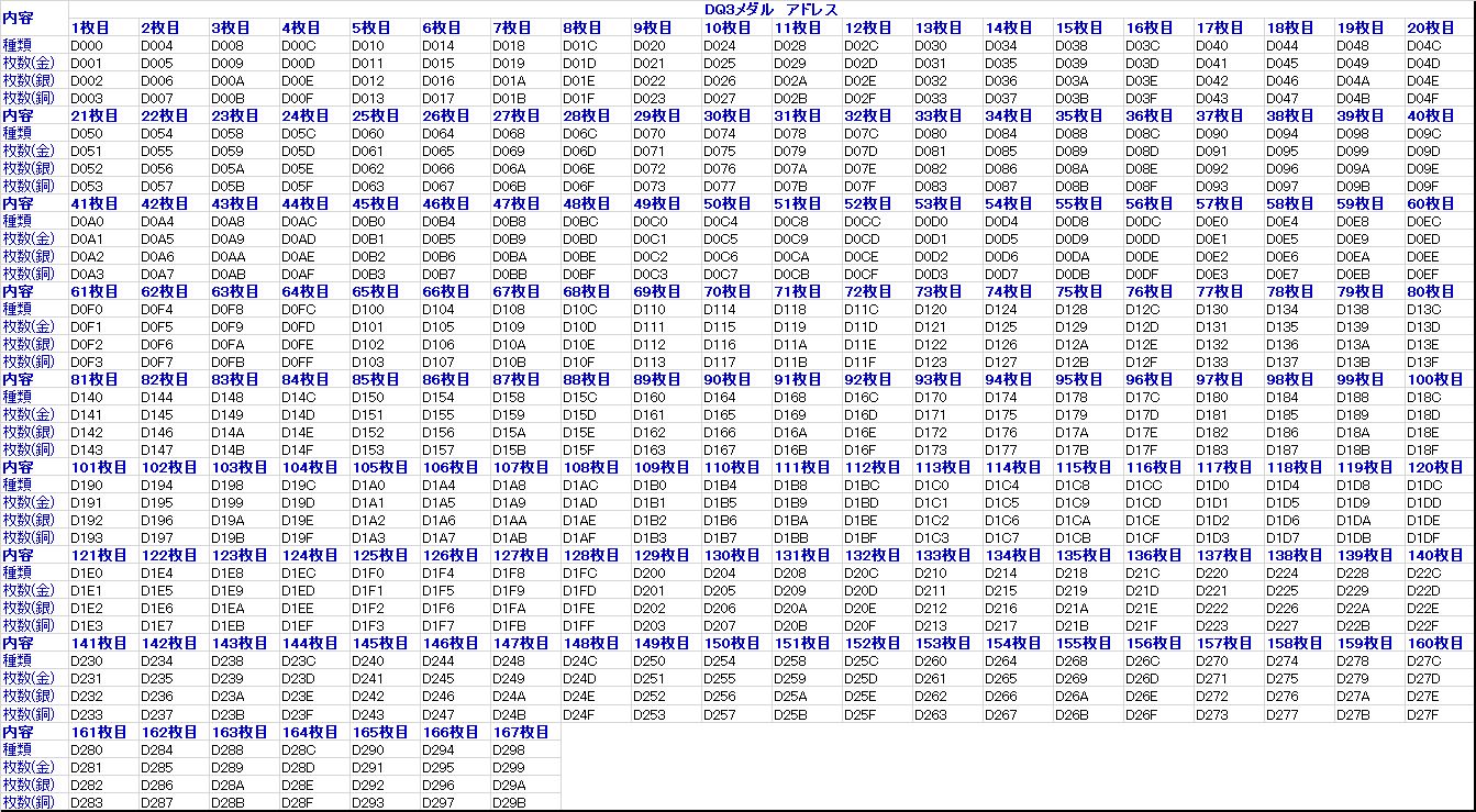 | 1枚目種類 | D000:yy | yyは下記DQ3メダル表参照。セーブデータには反映されない |