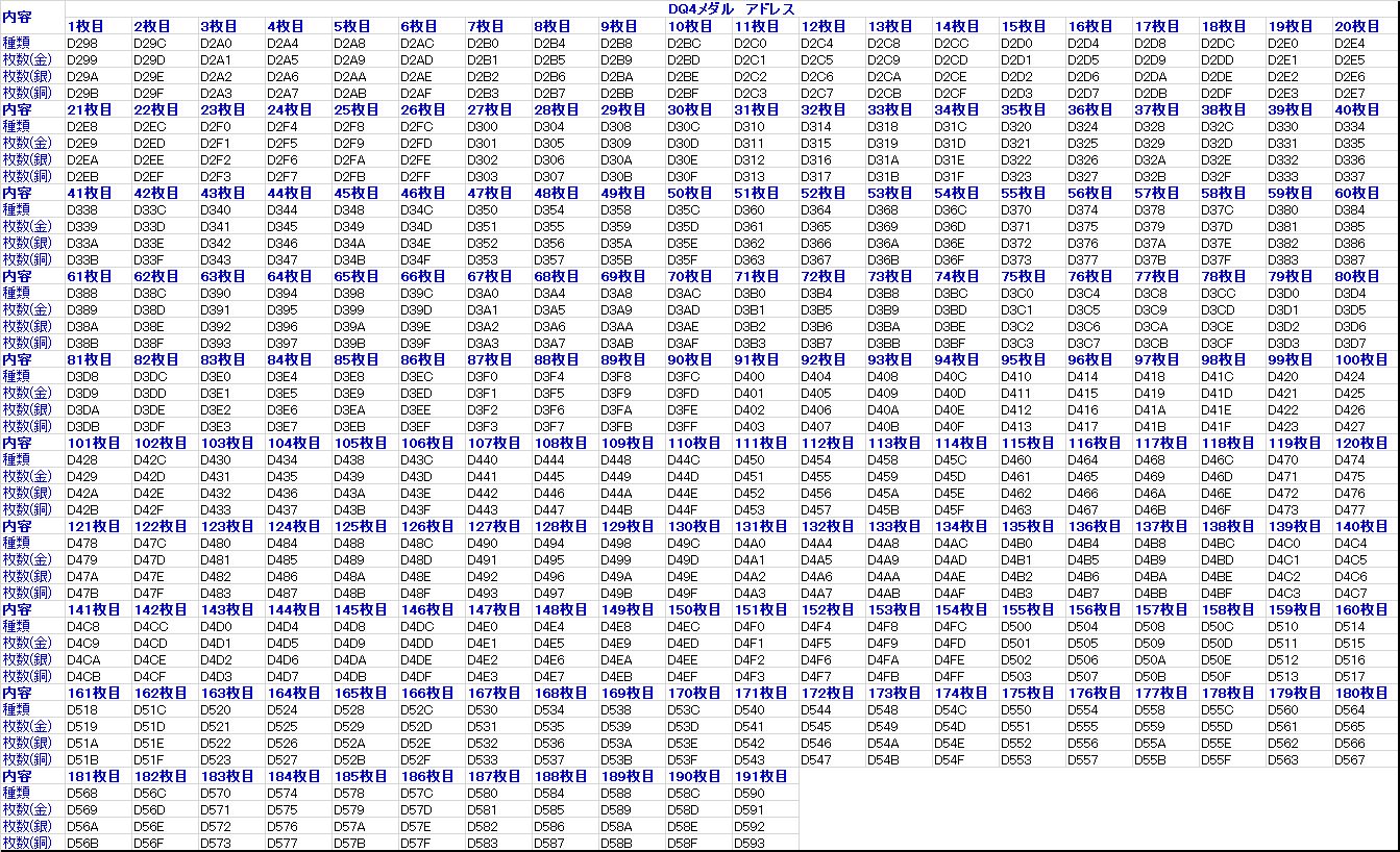 | 1枚目種類 | D298:yy | yyは下記DQ4メダル表参照。セーブデータには反映されない |