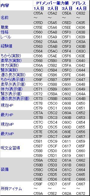 | 所持金 | C4DC:7F C4DD:96 C4DE:98 |