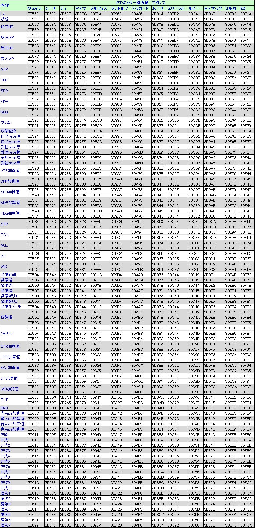 | 緑wave加算値 | 3D60E:63 | 仲間からの緑wave+99 |