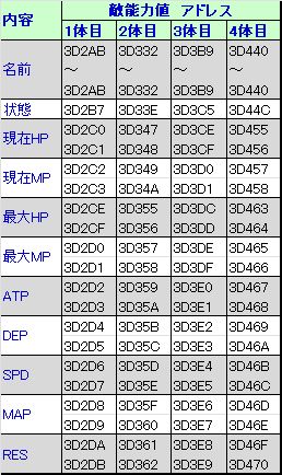 | 戦闘獲得金 | 3D2A3:7F 3D2A4:96 3D2A5:98 |