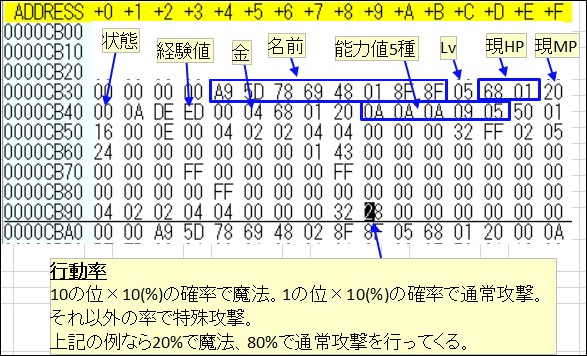 調査中のデータ。敵に関しては「物理攻撃、魔法攻撃、特殊攻撃」の確率を1byteで設定してある等、感心した部分もありました。