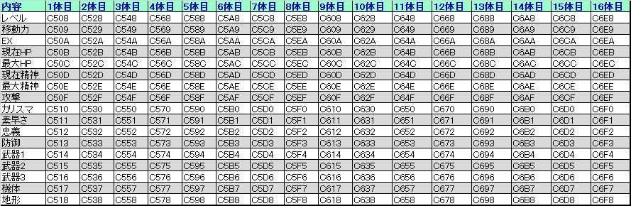 C181は未行動ユニット数。 以降のアドレスは各ユニットの行動状態を示す(80=未行動、C0=行動済) ユニット数は実際に合わせて設定しないと能力値ゼロのアフロダイが登場するので注意。 |
