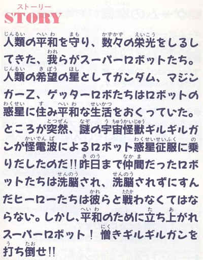 冒頭で「ガンダム系、ゲッター系、マジンガー系」のいずれかを選択して戦っていく戦略シミュレーション。殆どの敵を「説得」する事で仲間にできるシステムを採用しており、選ばなかった作品勢は敵として登場する。