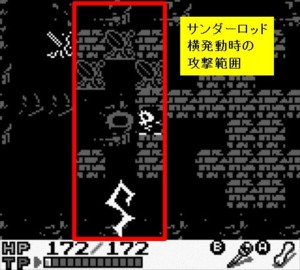 [Bサンダーロッド]縦3列に大ダメージ(詳細は下図参照)。ガレキの破壊効果は目の前だけ。エフェクトが長いがこの間はゲーム進行が止まる為、実質DPSは高い。実プレイ時間を気にしないのであれば使い勝手最強クラス。