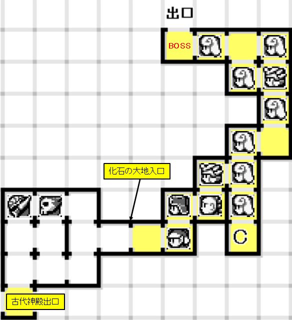 古代神殿(北口)から先の「化石の大地」に到着。以下の順に行動する。