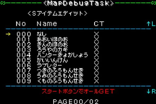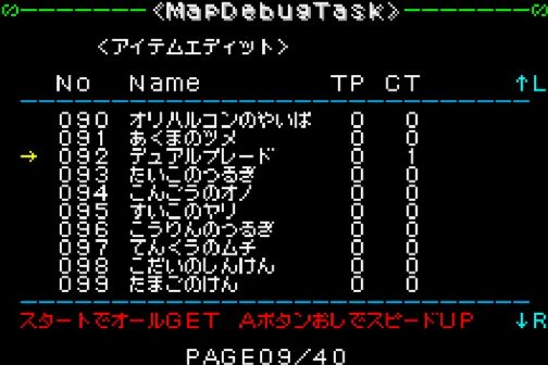 任意のアイテムを取得可能。LRボタンでページ切り替え、スタートボタンで全て99個取得状態になる。