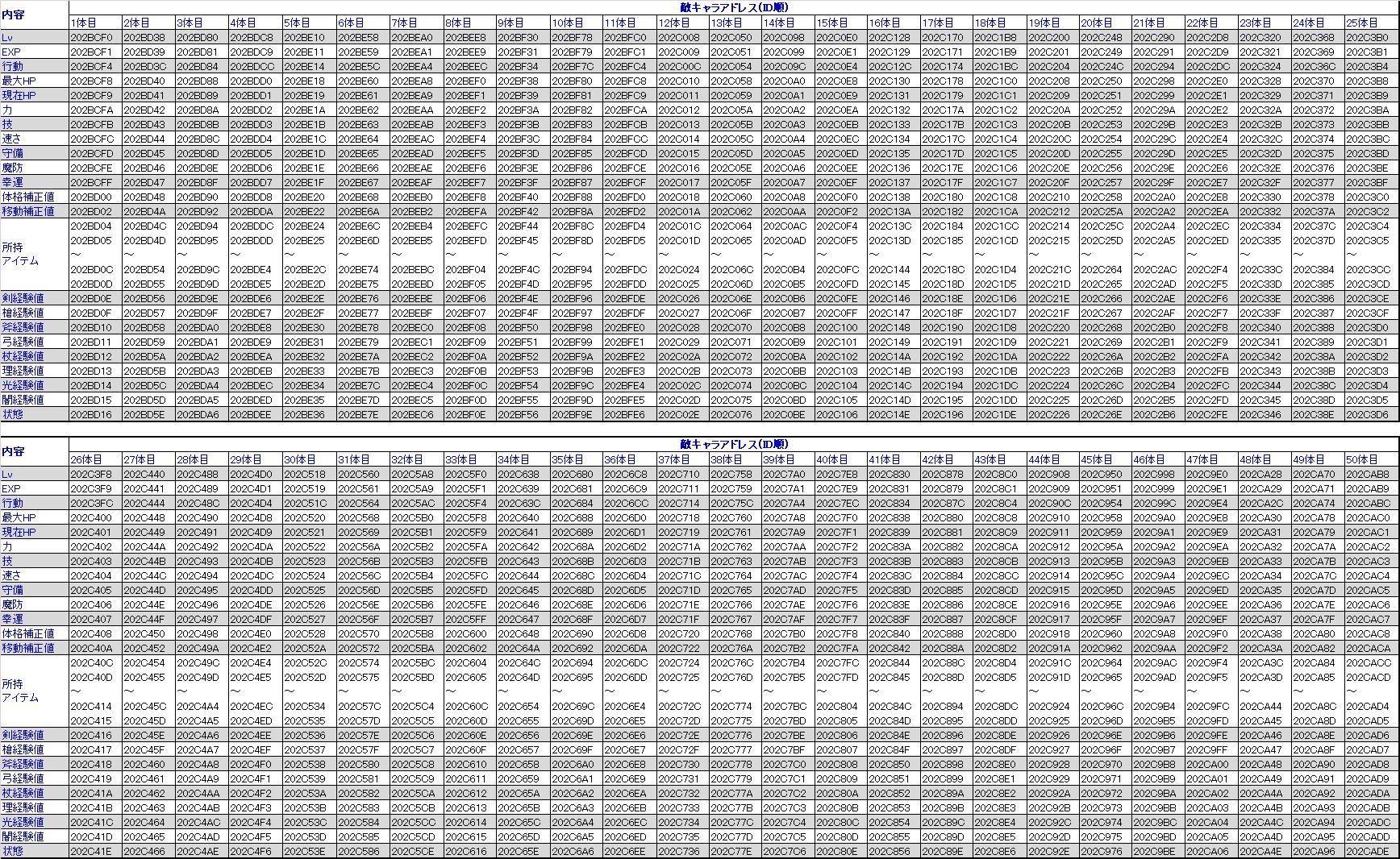 | ↓敵1体目能力値(2体目以降+48hずつ) | ||