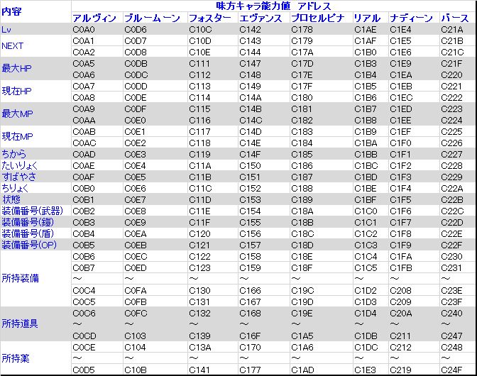 | 装備番号(武器) | C0B2:** | 装備しているアイテム。 **=装備欄のアイテム番号(01なら装備欄の一番上のアイテム) 能力値に反映され、武器を防具として装備させた場合は武器攻撃力が防御力に加算される。 |