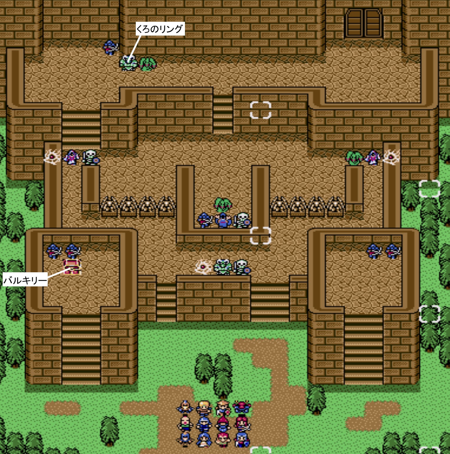 Battle.14![]() 【勝利条件:マスターメイジを撃破】敵総数:20 ウィッチ(HP28/ブレイズ3)×2 ブルー(HP35/ヒール3/ヘルブラスト1)×2 スケルトン(HP27)×3 ミストデーモン(HP35/飛行/ブレイズ2)×3 マスターメイジ(HP35/フリーズ2)×1 ヒドラ(HP37/炎攻撃[射程1、約15ダメージ])×3 ボウライダー(HP38/射程3)×6 要塞戦だが屋外の為、飛行キャラで壁抜け可能。通路は狭い為、両翼から攻めるのが効率が良い。間接攻撃と飛行キャラで確実に一体ずつ落としつつ進もう。尚、中央の連中はいかにも待ち構えて間接攻撃してきそうだが、右上の門に向かって移動していく為、進入の際は警戒する必要は無い。奥のブルーは「黒のリング」を装備しており、攻撃力が+10されている。また、新顔「ヒドラ」は守備力無視の炎攻撃(約15ダメージ)を仕掛けてくるので注意。 |