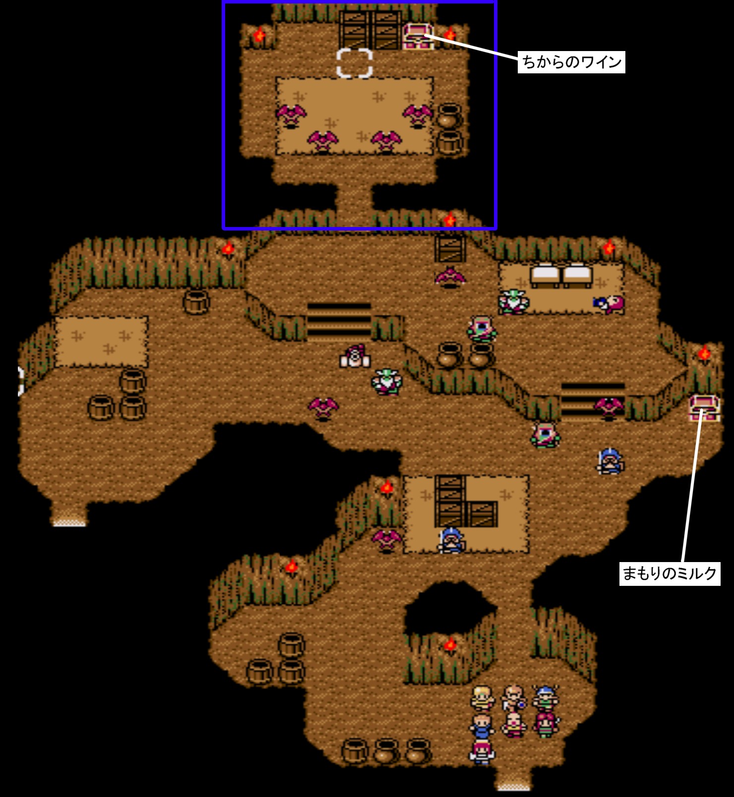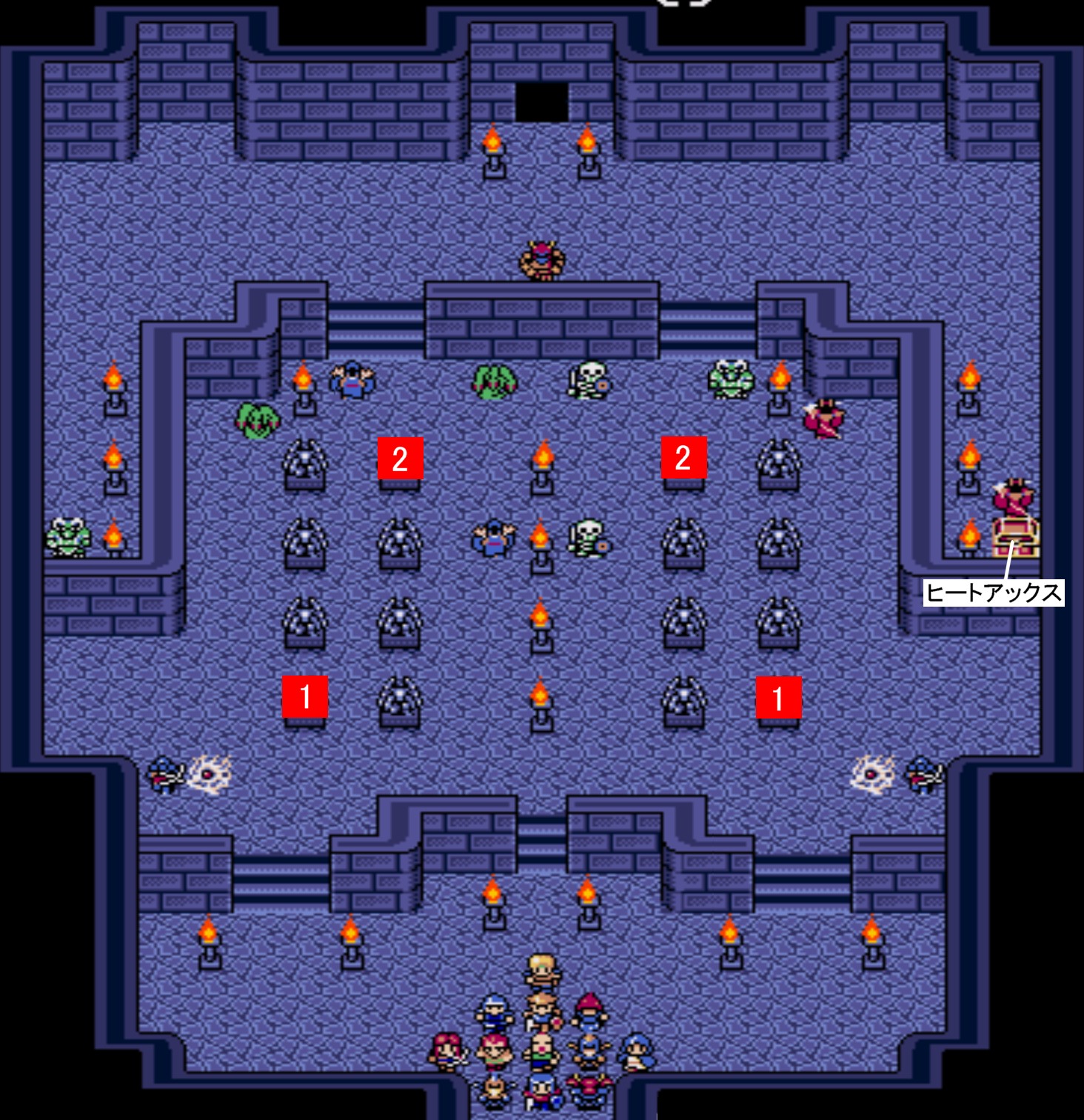 Battle.5![]() 【勝利条件:ブラスローダーを撃破】敵総数:11+(増援4) オーク(HP11)×2 ダークドワーフ(HP13)×2 ハンターゴブリン(HP15/射程2)×2 オオコウモリ(HP16/飛行/睡眠攻撃)×4+(増援4) ブラスローダー(HP18/射程2)×1 脅威となるのはオオコウモリの睡眠攻撃くらい。ある程度進軍するとイベントが発生し、上図青枠の部屋が出現。ブラスローダーを倒すとステージクリアとなってしまう為、宝箱2つはその前に取得する事。 ステージクリア後、シーフのルブラン(Lv5)が加入。 |