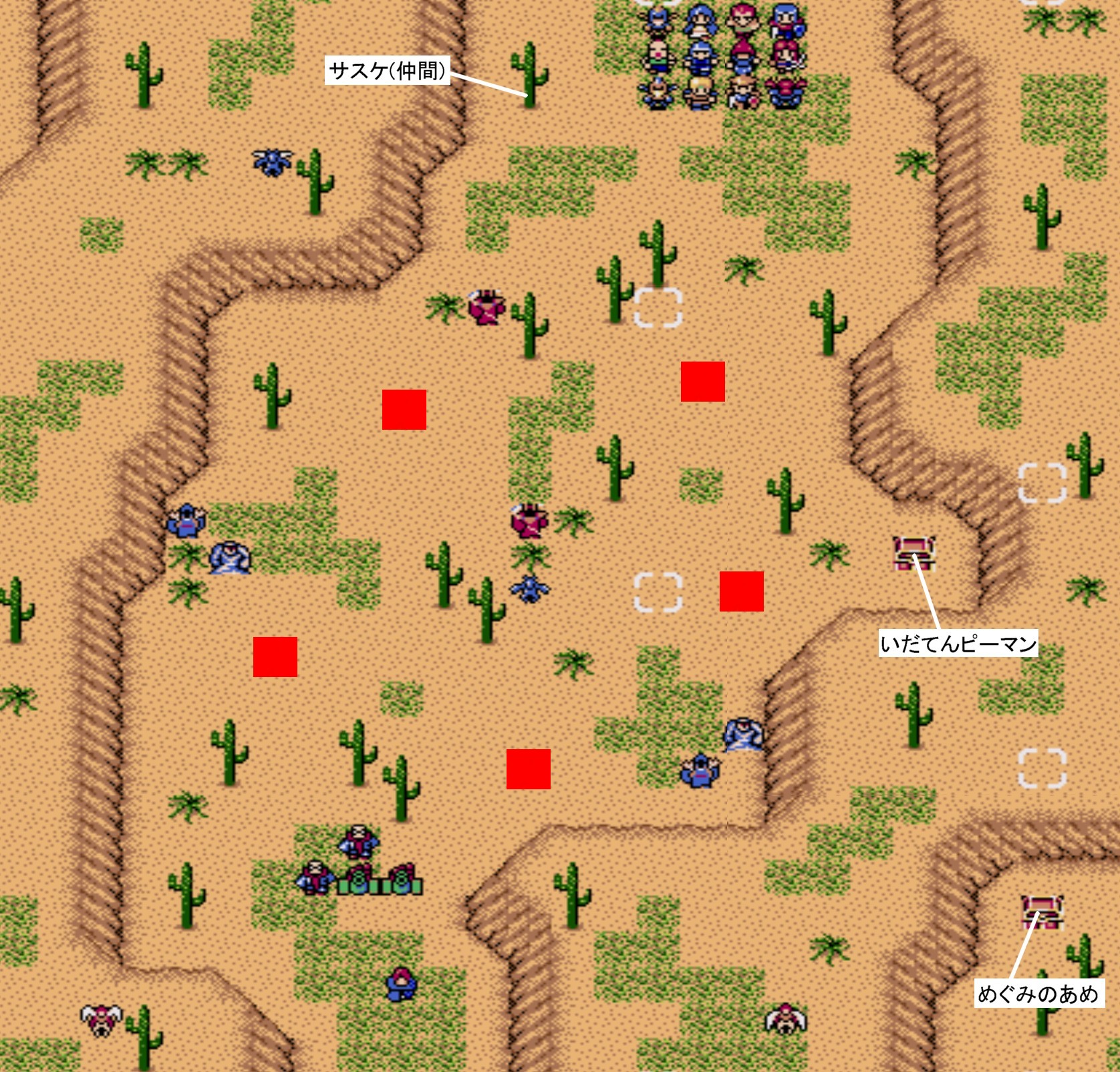 Battle.16![]() 【勝利条件:ミシャエラを撃破】敵総数:15+(増援5) ストーンゴーレム(HP28)×2 ガーゴイル(HP34/飛行)×2 マスターメイジ(HP35/フリーズ2)×2 ハーピィクイーン(HP37/飛行/毒攻撃)×2 エグゼキューター(HP39)×2 ハイプリースト(HP41/ヒール4/ヘルブラスト2)×2 ブラスガンナー(HP34/射程3)×2 ミシャエラ(HP95/スパーク2/行動後MP2回復/攻撃魔法強耐性/高確率反撃)×1 サンドウォーム(HP37/サンドブレス[射程3、十字広範囲、約12ダメージ])×(増援5) まず初期位置から左のサボテンを調べてサスケを仲間にしよう。リターンして本陣で入れ替えを行えばこのステージからすぐに運用可能。本MAPは全て砂地となっており、移動距離は著しく落ちる。特に騎士系は2歩しか歩けない。飛行キャラ3人を軸に慎重に進みたい。尚、上図赤マスに近づくとターン開始時に「サンドウォーム」が出現。十字広範囲に約12ダメージを与えてくる「サンドブレス」は集団でやられると非常に脅威。速攻で倒してしまおう。ミシャエラは十字広範囲のスパーク2を使ってくる。ハイプリーストを倒してから集中攻撃をかけよう。 |