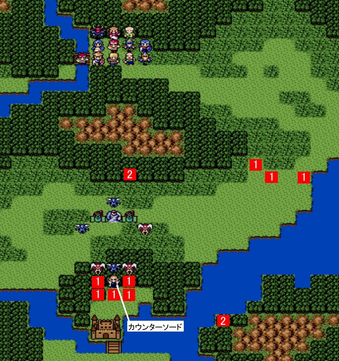 Battle.8![]() 【勝利条件:敵全てを撃破】敵総数:16 ウォーム(HP16/毒攻撃)×3 ブラスローダー(HP18/射程2)×3 ダークスモーク(HP18/飛行/ブレイズ1)×2 ダークメイジ(HP22/ブレイズ2)×2 オークロード(HP19)×2 ダークナイト(HP21)×2 プリースト(HP21/ヒール2)×2 橋を4体の敵が塞いでおり、交戦していると背後のダークメイジがブレイズ2を撃ってくるというなかなか策士な配置。橋での交戦は互い違いに待機する様に心がける事。 ステージクリア後、「騎士のシルビア(Lv9)、鳥人のジュリア(Lv9」が加入。 |