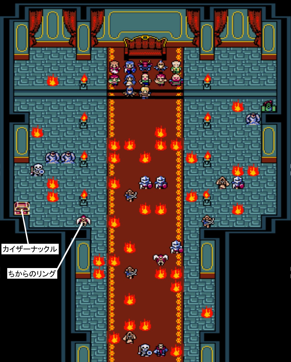Battle.18![]() 【勝利条件:全ての敵を撃破】敵総数:18 ストーンゴーレム(HP28)×3 ハーピィクイーン(HP37/飛行/毒攻撃)×2 ブラスガンナー(HP34/射程3)×1 アークナイト(HP42)×4 ハイウィッチ(HP40/フリーズ3)×2 ハイプリースト(HP41/ヒール4/ヘルブラスト2)×1 キャノンナイト(HP42/射程3)×3 スカルウォリアー(HP40/高反撃率)×2 炎が阻む城内戦。炎は飛行キャラであっても乗り越える事は出来ない。炎越しにハイウィッチの魔法、キャノンナイトの砲撃が来る厄介なMAP。まず炎を避けて左右に分かれて進軍すると良い。宝箱のカイザーナックルは意外にも呪い武器。 ステージクリア後「カオスブレーカー」入手(勇者専用の剣)。同時に「必殺の剣、バルキリー」といった最強クラスの武器が購入可能になる。 |