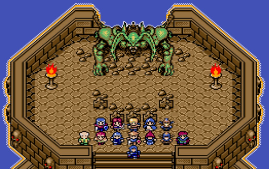 Battle.20![]() 【勝利条件:マックスを撃破】敵総数:20 レッサーデーモン(HP44/飛行/スパーク1)×2 スカルウォリアー(HP40/高確率反撃)×2 ダークシャーマン(HP49/オーラ3/ヘルブラスト3)×2 キャノンナイト(HP42/射程3)×4 ミシャエラドール(HP51/スパーク2/攻撃魔法半減)×3 ダークジェネラル(HP50/デーモンブレス[射程2、十字範囲、約20ダメージ])×2 パイロヒドラ(HP52/炎[射程1、単体、約22ダメージ])×2 デーモン(HP47/飛行/デーモンブレス[射程2、十字範囲、約20ダメージ])×2 マックス(HP45/スパーク3/暗黒の剣[ソウルスチル1])×1 増援やギミックといったクセは無いが、スパーク2を使うミシャエラドールが3体もおり、高威力十字範囲のデーモンブレスを吐くダークジェネラルとデーモン、炎を吹くパイロヒドラと遠距離攻撃を行うキャノンナイトと厄介な敵が揃っている。戦略としては、丈夫なキャラを1人先行させて釣って撃破が一番。特にミシャエラドールは十字広範囲のスパーク2を防ぐ為にもこうする必要がある。奥のダークシャーマンが落とす「白のリング」はこの先必要になるので絶対に取っておきたい。ボスのマックスはスパーク3も脅威だが、一番脅威なのは暗黒の剣によるソウルスチル。主人公が運悪くコレを食らうと全滅となってしまう為、主人公以外で攻めたい。尚、マックスはスパーク4一発で倒せる。 ステージクリア後、勇者のマックス(Lv12)が加入。 |