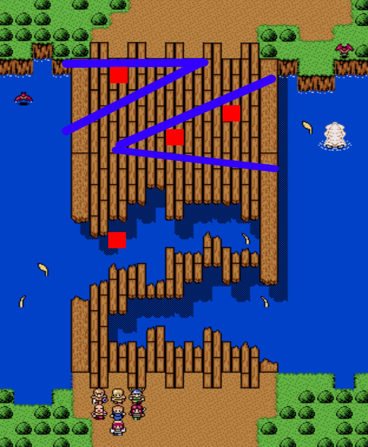 Battle.4![]() 【勝利条件:誰か一人が橋を渡りきる】敵総数:7+(増援4) オオコウモリ(HP16/飛行/睡眠攻撃)×2 クラーケンレッグ(HP14/海上のみ移動)×3+(増援4) クラーケンアーム(HP19/海上のみ移動、射程2)×2 大橋を渡りきればクリア。ある程度進軍すると上図の青線で区切った場所がさらに崩れ落ちる。どんどん幅狭になるので、味方同士で詰まらない様に。 さらにある程度進軍すると、上図赤マス地点に「クラーケンレッグ」出現。スルーでも良いが、全ての敵を倒してから渡ると謎のキャラが出現するシーンが追加される。(特にメリットは無い) |