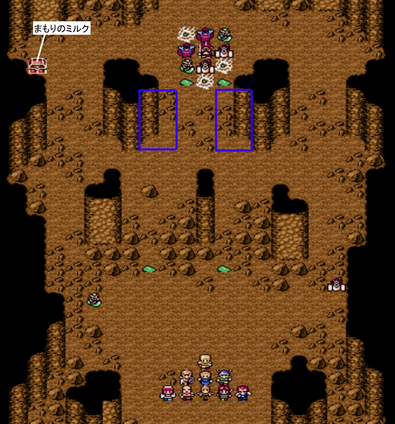 Battle.7![]() 【勝利条件:オークロードを撃破】敵総数:16 グリーンペースト(HP15/毒攻撃)×4 ウォーム(HP16/毒攻撃)×3 ブラスローダー(HP18/射程2)×3 ダークスモーク(HP18/飛行/ブレイズ1)×3 ダークメイジ(HP22/ブレイズ2)×2 オークロード(HP19)×1 中程まで進むとイベント発生。上図青枠部分が落盤し、狭くなる。奥の敵は固まっているが、進軍すると共にバラける。それでも多い事に変わりないので、慎重に釣っては倒していこう。新顔のダークスモークは飛んで来てはブレイズ1を使ってくる為、連続で受けない様に1体ずつ釣って倒そう。 |