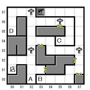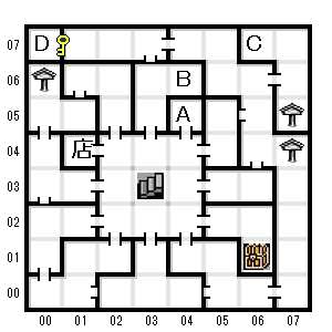- Cで「くろいかぎ」入手。同時に近くのドアが壁に変わり、閉じ込められる。脱出するには鍵の代わりに「らっきょ」を入れるか、「どんぱうんぱ」を利用する方法がある。