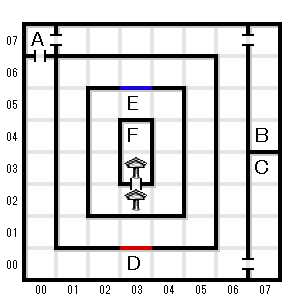 - Bにあるスイッチを押すと[X0.Y5]の壁が消失して通過可能になる。