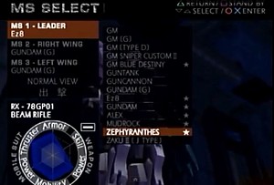 各ミッションをクリアする度にモビルスーツが支給され、乗り換えが可能になる。性能は機体によって決まっており、自由度があるのは遠距離武装のみ。一例として、ザクⅡならマシンガン、バズーカ、ライフルのどれか。