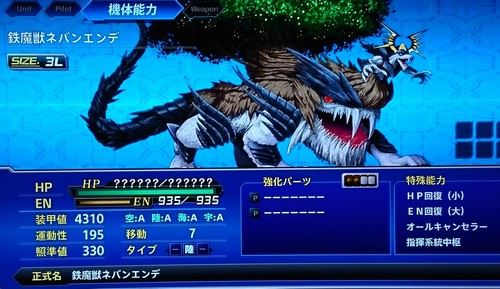 2500円で購入可能な、ED後の世界の裏ボス。高難度ルート。| 鉄魔獣ネバンエンデ Lv180、HP536000 HP回復(小)、EN回復(中) 3回行動、底力6、極、ガード3、プレッシャー4 厄介ランクB(従来の全スパロボの中で比較評価) 平行世界から来た魔獣エンデとネバンリンナが合体した姿(いずれもスパロボV・Xのラスボス)。主人公達へ復讐する為に、エンデが宿敵達の魂を、ネバンリンナがその器(機械の体)を生産し、主人公達へ無数の敵を差し向けた。 コレと戦う前にエンデ1体とネバンリンナ10体を倒す必要があり、こちらは弱った状態でこのネバンエンデと戦う事になる。ただ、いずれも回復イベントは無い為、真ゲッタードラゴンを過剰強化していれば楽勝な部類。 |