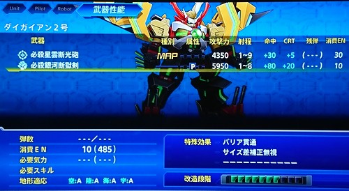 難易度としてはヌルゲー化の一途を辿っていると思っていましたが、本作は割と難しめでした。なにしろザコの一撃でグレートマジンガーのHPを半分持っていかれるとかザラです。スパロボFを思わせる状況!(゚д゚) とはいえ、初回からエキスパートモードだったからというのもあるのですが、VやXではそれでもヌルゲーだったので、個人的には歯ごたえあって良かったです。