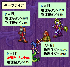 戦闘中でもターン経過等のデメリット無しで陣形変更は可能な為、アイテムや魔法で攻める状況なら防御効果の高いキープライフをチョイスする判断もアリ。 - 狙われ率は陣形によって大差なく、体感では1人目が主に狙われ、1人目が倒れると何故か3人目が主に狙われる模様。