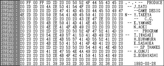 - ROMアドレスを解析すると下図の様な開発者クレジットが見られる。