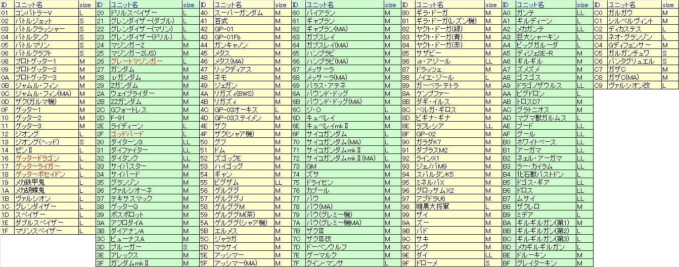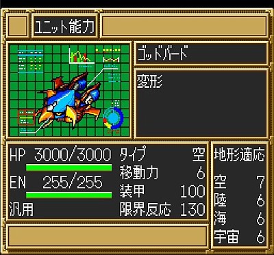 - 没ユニットは前作ほど多くないが、唯一「ゴッドバード」がある。恐らくライディーンの変形形態として設定だけはしていたものと思われる。コード改変で実際に使おうとしても武器設定が正常でない為、フリーズするので注意。