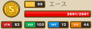 - 能力値はAGI>STR>VIT>INTを推奨。敵とのぶつかり合いが大前提の本作では回避率がかなり重要で、後述の回復装備を活かす意味もあってAGIの貢献度は高い。参考までに管理人の最終能力値は下図の通り。