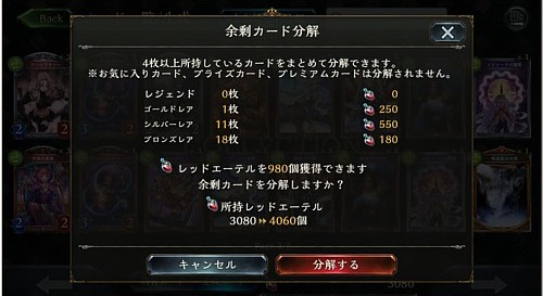 同じカードは3枚までしかデッキに入れられない為、それ以上にダブったカードはレッドエーテルに換えて欲しいカードを買うといった事も出来る。これにより、何か一人のキャラデッキに絞って他のキャラカードは全て売却といった無課金プレイを楽しむ事も可能。
