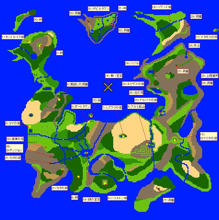 | 22 | コマの街から南の川を船で通り、カタ北の洞窟に進入。B2Fの宝箱から「金の鍵」入手。 以降は金の扉が開ける事が出来る様になる。ポートタウンで宝箱の回収が可能で、セントルイス城とハミルトン城では情報収集が可能。 |