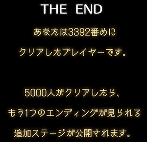 ちなみに、クリア人数が5000人に達したらアナザーエンディングが追加される仕組みの様です。管理人はリリースから5か月程経過した、遅いタイミングでのクリアでしたが、それでも3392人目でした…。5000人に到達するのかな?(´Д`|||)