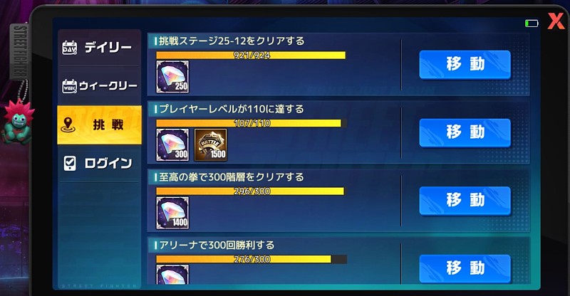 - 「挑戦」のステージ15-40をクリアすると「占い」が解放される。1回500ジュエルで引けるガチャで、設定したキャラを2%の確率で引ける。これでベガをはじめとした強キャラを現実的に引ける様になる為、ジュエルは貯めておこう。