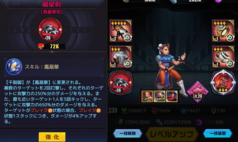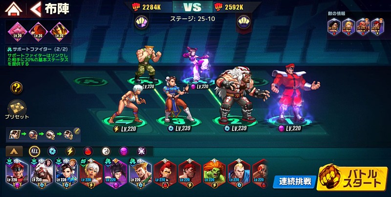 - 管理人の基本編成は以下の通り。「SPD上げて高スパンで必殺技連打」がテーマ。ベガで受けて2番手に丈夫なアタッカーのザンギエフを配置し、春麗で高スパンで必殺技を連射する。それによってエレナの回復技も撃ちまくるというよくある内容。相手がベガ編成であってもザンギエフのコンボ2で敵を纏め、春麗の流星刺で後衛ごと倒す事も可能。陣営ボーナスは魔王2人を敷いて「DEF+15%、SPD+10」を設けているが、凸るのが進んでくるとSPD+10は些細になるので疾風キャラに変更しても良いかも。